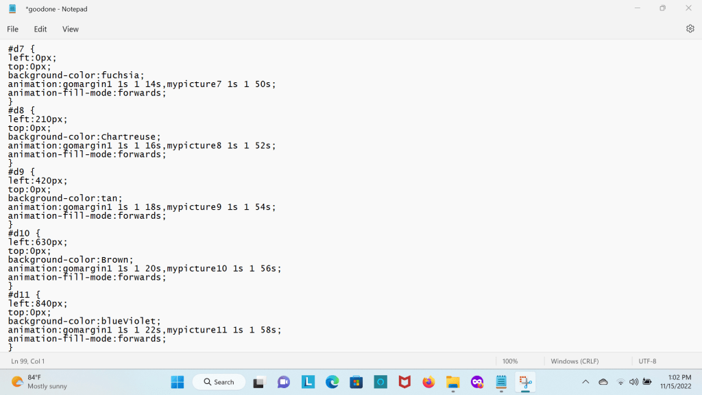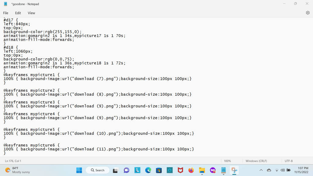 I wrote a webpage with CSS ANIMATIONS I animated 18 div elements. I made them all invisible at first then though css animations I had the div elements appear. To move them down the page I used the margin-top property while the element was going down I turned the square div element into a round div element giving each one a different color. Each of the div elements were divided into 3 classes. Each div had a different position and the 3 classes had 3 different margin-top properties